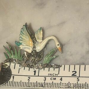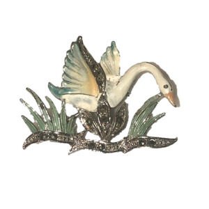 VTG Alice Caviness Marcasite Painted Swan Cygnet Brooch Silver Tone Metal 1.5”