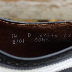 Vintage '90s Allen Edmonds "Broadstreet" smooth black with tumbled white spectator wingtips, size 14 D. Uppers are in good condition with only a few scuffs and cuts (see pics); they have been conditioned with Saphir Medaille d'Or premium wax polish and Meltonian shoe cream.