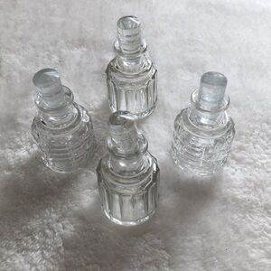 VTG Apothecary bottles scents, vinegar, oils, glass England toppers set (4)