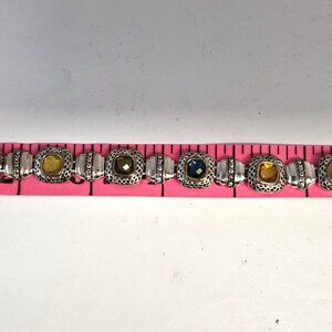 Step into vintage glamour with this Art Deco revival bracelet, featuring geometric silver-tone links set with multicolored faux rhinestones. Measuring 7.5 inches long, it secures with a magnetic clasp for easy wear. A bold yet elegant piece from the late 1990s–2000s, perfect for retro styling, bridal accents, or statement layering.