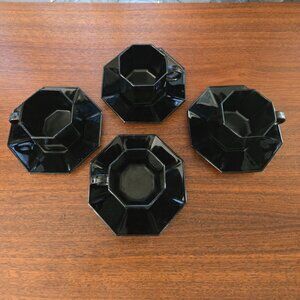 Set of 4 Vintage Octagonal Black Tempered Glass Teacups, 4 Cups and 4 Saucers