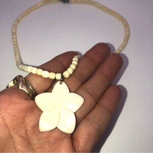 VTG Bone Bead Necklace & Flower Pendant w Hook Clasp 19” & 1.5” Pendant