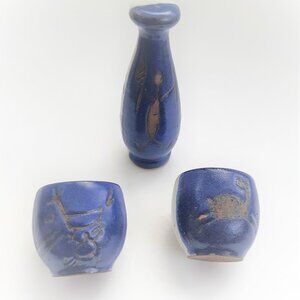 A beautiful rustic gray and cobalt blue finish with brown figures.