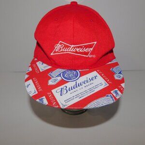 This One Size Adjustable Snapback Vintage Budweiser King of Beer Red Label Print Beak Baseball Hat Cap is in good clean condition. Features embroidered Logo on Front Material tag has been removed.