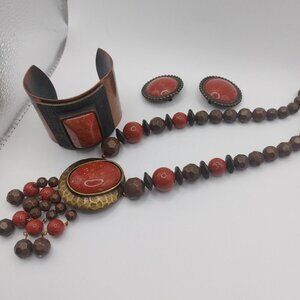 Necklace -Vintage tasseled pendant Carnelian necklace set is in wonderful brick red, with antique brass beads and a tassel. 18" long with a 4.25 pendant containing a 2" carnelian stone with carnelian stones, copper disks and hammered copper beads in the necklace. Bracelet - Gorgeous vintage chunky bracelet is 2.25" thick and 6" cuff adjustable to fit all with a brilliant setting of copper etching and a 1.5" carnelian stone. Earrings - Gorgeous 2" round clip on earrings with 1 1.25" carnelian stone surrounded in antique brass setting completes this gorgeous set.