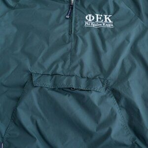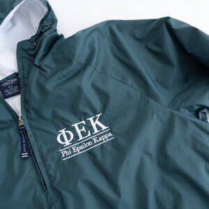 Embrace classic collegiate style with this Vintage Charles River Apparel pullover windbreaker jacket in a rich hunter green. Designed with a nod to Frat House culture, this jacket features a Phi Epsilon Kappa embroidered logo, making it a perfect choice for alumni or fans of Greek life. The jacket is crafted from nylon for wind resistance and is cotton-lined for added comfort and warmth.