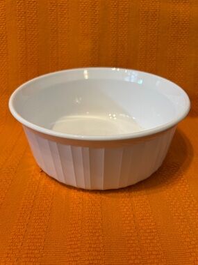 Corning Ware French White round casserole baking dish (F-5-B Embossed Stamp on bottom). It is ~7 3/4” round and ~3” tall - 1.6 litres | 7 cups. Can be used in the oven, broiler or microwave. It is freezer and dishwasher safe and is in very good condition. No chips, nicks or cracks.