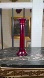 The vase stands at approximately 9 inches tall and its unique form makes it a striking decorative accent, perfect for displaying a single long-stemmed flower or as a standalone piece of art on a mantelpiece, bookshelf, or as a centerpiece. The rich, ruby-red color is a signature of genuine cranberry glass, a collectible material known for its creation using gold.