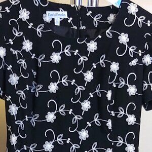 VTG David Brooks Women’s Scoop Neck Short Sleeve Black White Floral Embroidery Midi Dress Size M 8 10