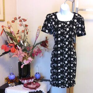 VTG David Brooks Women’s Short Sleeve Black White Floral Embroidery Midi Dress M