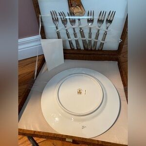 VTG. Dessert Plate and 6 Cake Forks In Original Box with Certificate - Italy