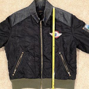 VTG Energie by Sixty, Men's Designer Bomber Jacket, Made in Italy in the '90s. With added Vespa Scoot Expo badges. Black with denim shoulders and collar, green knitted cuffs and waistband.