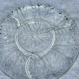 THE PLATTER IS A ROUND, CLEAR, PRESSED GLASS DISH FEATURING A BOTANICAL DESIGN WITH FOUR SECTIONS.