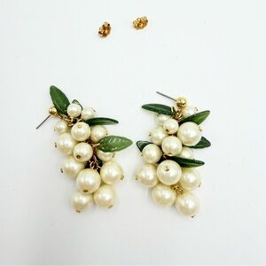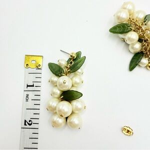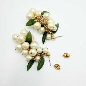 VTG Faux Pearl Cluster Dangle Earrings with Jade Glass Leaves Grape Cluster