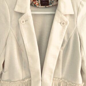 VTG Free People cream/winter white jacket in cotton blend, women's size 8 with sheer peplum waist. Shawl collar with one clasp closure. Bohemian hippie luxury holiday event styling.