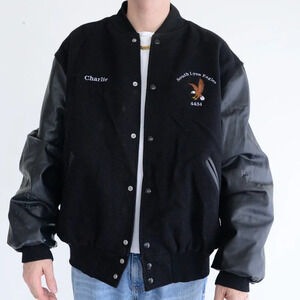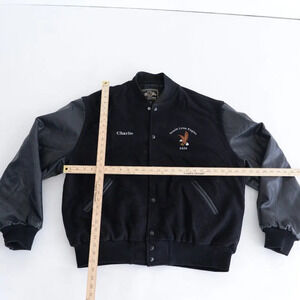 Crafted with a premium blend of leather and wool, this jacket offers both durability and comfort. The sleek black leather sleeves add a touch of rugged elegance, while the wool body provides warmth and a sophisticated look. The embroidered S Line Eagles logo on the chest showcases intricate detailing, reflecting the high quality and authenticity of Holloway's design. Note right sleeve marks, Charlie embroidered on chest.