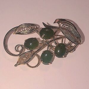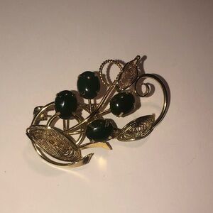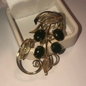 Vintage Jade Gold Tone Filigree Large Brooch Unmarked, great condition!