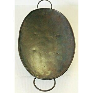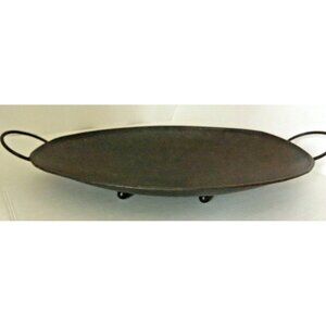 VTG large oval black sheet hammered metal display tray with legs and handles. Country style .