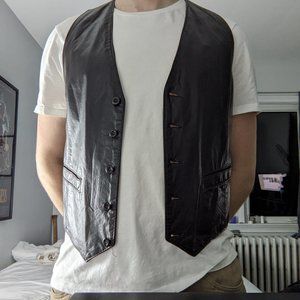 Brown Leather vest from the Leather Attic. Fits real well. I included a photo of it on me for reference but the color in the other photos are more accurate. In very good condition.