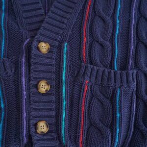 This vintage Leo Chevalier Sport navy cardigan is a bold yet classic statement piece, featuring multicolor stripe detailing and an intricate cable knit design. Made from 100% cotton, it offers a soft, breathable feel while maintaining structure and warmth. The deep navy base, accented with vibrant stripes, gives it a timeless yet eclectic aesthetic, perfect for vintage lovers.