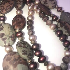 VTG Leopard Skin Jasper Freshwater Pearl Multi Colour Multi Strand Necklace 21”