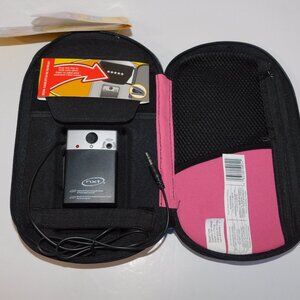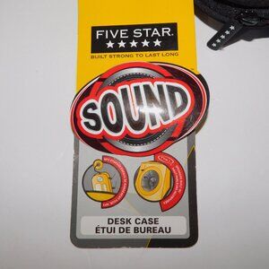 This vintage 2006 Mead Five Star Black Pink SOUND Desk Storage Case with Built in Amplifier Speaker is in New with Tag condition. Use any musical device that has the ability to use an Aux Cord / sound jack ( Note Many current phones do not have this option - check before purchase) . Plug your device into the sound amplifier inside the case and hear your music play. Has kick stand to keep the lid up to listen. Other side of case has zipper section to hold desk items . Has small zipper pocket on front to hold a key or Change / Money. Measures 10" long x 6" wide and 5" deep. Requires 4 AAA batteries.
