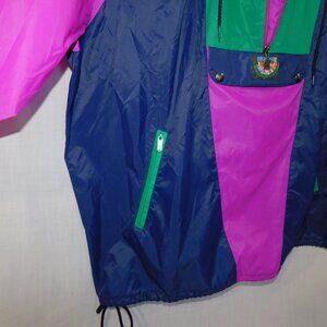 This Vintage 90s K-Way Men's 2XL Pink Purple Teal 1/2 Zip Pullover packable Hidden Hood Windbreaker jacket is in overall GREAT clean bright condition . Features Neck Drawstring with K-Way Toggles on each end. K-Way Zipper Pull. 2 Front side Zipper hand pockets. Front Snap close pocket (where straps are attached and turns inside out to become the packable pouch). Airholes under the arms to keep air flow. Hidden Hood in zipper back neck.