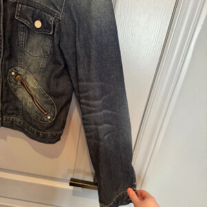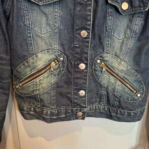 Iconic vintage Miss Sixty cropped denim jacket with zipper pockets and hardware detailing on the front and back, branded Miss Sixty buttons, adjustable hemline, and intentional fading and whiskering, in a medium to dark wash. All zippers are functional. The perfect Y2K jean jacket 💖