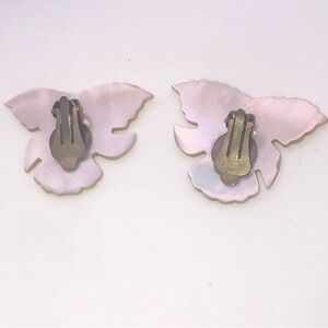 Vintage carved mother of pearl flor daffodil flower clip on earrings - nice big Irridescent statement earrings.