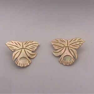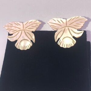 Vtg Mother Of Pearl MOP Carved Flower Flower Daffodil Clip On Earrings 1.5”