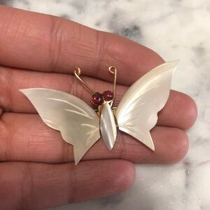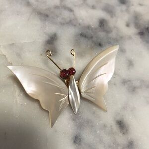 Vintage mother of Pearl moth brooch with garnet eyes approx 2.1” x 1.1”