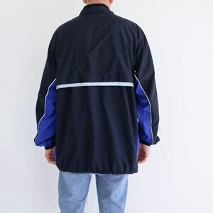 Crafted with a lightweight yet durable fabric, this windbreaker is designed to protect you from the elements while ensuring breathability. The navy and blue color scheme is classic and versatile, complemented by the subtle yet recognizable gray Nike tag. The fishnet lining adds an extra layer of comfort and ventilation, perfect for those long runs or casual outings.