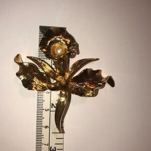 Excellent condition Nina Ricci gold tone Iris brooch w Pearl accent 2.5”