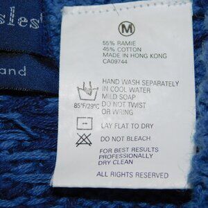 This beautiful Vintage Northern Isles Hand Knitted by Hand Blue Multicolor Design Crew Neck Pullover Sweater is in great clean bright condition. Sweater is 55% Ramie - 45% Cotton - Hand Wash - lay flat to dry.