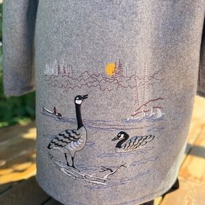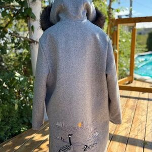 Distinctive Embroidery: The coat is adorned with detailed, high-quality embroidery featuring Canadian nature scenes, including a majestic goose in flight, a canoe with paddlers, and other waterfowl. This detail makes the coat incredibly unique and a true collectible.