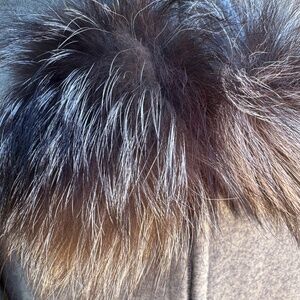 Luxurious Fur Trim: The hood is trimmed with rich, voluminous fur (likely a type of fox or raccoon, based on the coloring and length) that drapes beautifully. The collar is accented with two adorable fur pom-poms.