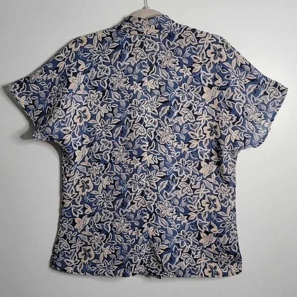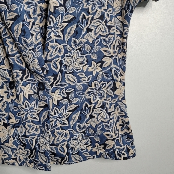 The blazer jacket is short sleeved and has a shawl collar. It has single set of buttons. The fabric is light and in a blue and white floral print. It is in very good condition with no signs of rips, stains, or other damage. The tag says "12". Measurements shown are taken by me with the blazer lying flat. Dimensions may vary slightly.