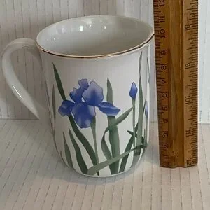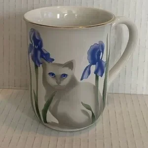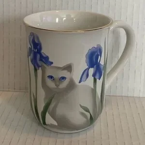 Elizabeth King Brown for Otagiri ceramic porcelain cat mug with purple irises 10 Oz In excellent condition no chips no cracks no stains from smoke free home gold colour trim in great condition.no chips no cracks no stains. Bundle and save.