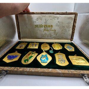 VTG Peking Enamel Pendants from the 1960s - 70s complete set of 10 in silk case
