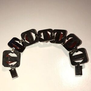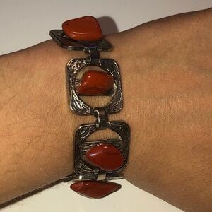 Vintage red jasper stone silver tone bracelet. Silver tone metal has a wood grain looking texture to it, no stamps or marks - excellent condition