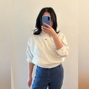 Very cool vintage Reebok cropped pull over sweater. Small logo at front, large logo at back. Red piping throughout. Double zip feature on neck.
