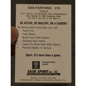 Very cool, very retro 1990's Saskatchewan Roughriders Royal Studios card! This was a series of CFL Roughriders cards produced in the 90s for Sasksport Inc. and Saskatchewan Health. They were distributed throughout Saskatchewan in schools. Dan Farthing came to my school and handed out self autographed cards! This is one of them that I got. Signed in blue pen, IT IS NOT AUTHENTICATED, but he did hand it to me, lol.
