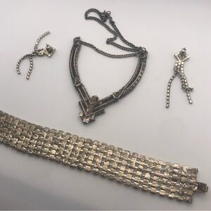 VTG Rhinestone Silver Tone Metal Set Necklace Earrings Bracelet 16”/ 2” / 7.5”