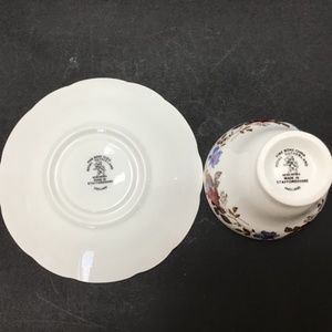 Marked on the bottom of cup and saucer: Fine bone china, Royal Sutherland, lion, Made in Staffordshire England. Both pieces are completely damage free and colors are bright and vivid.