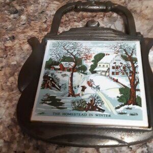 VTG SEVEN 7 STAR Cast Iron Tile Trivet “The Old Homestead in Winter" tea pot