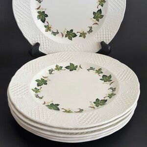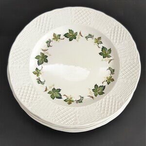 Concord pattern features a garland of green ivy or grapes leaves and vines with basket-weave embossing around the rim