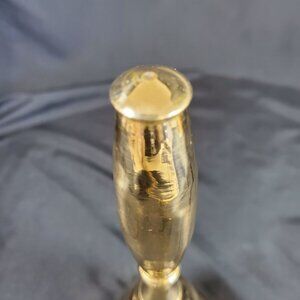 This vintage solid brass hand bell features a beautiful elongated handle and polished golden finish with just the right touch of age and patina. Measuring approximately 8 inches tall with a base diameter of 3.5 inches, it produces a charmingly clear ring from its original metal clapper.