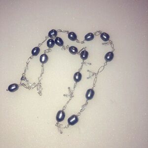 Cute sterling silver necklace w purple grey coloured pearls, Crystal bead dangle accents on lower portion of chain / necklace.