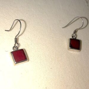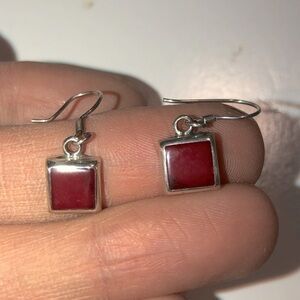 Vintage sterling silver and square red jasper stone earrings - slight black veining can be seen within stones, beautiful deep red colour. Shepherds hook posts.