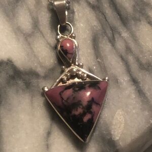 VTG Sterling & Rhodonite Pink / Black Triangle Pear Stones Pendant & Chain 19”